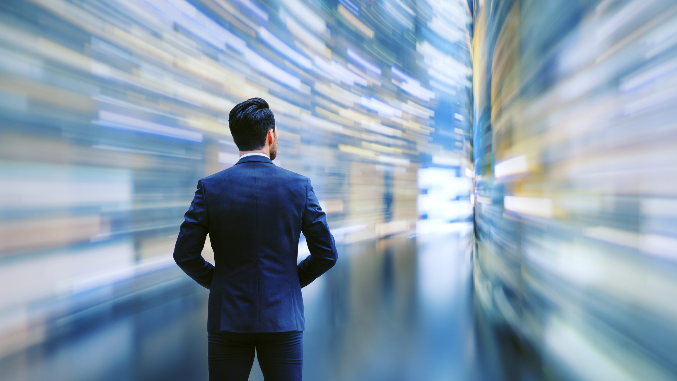 Business man observing fast speed dataflow